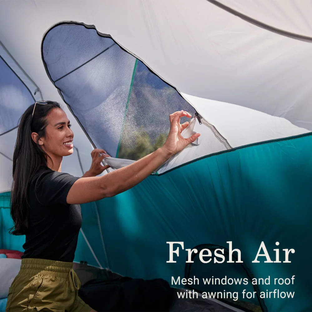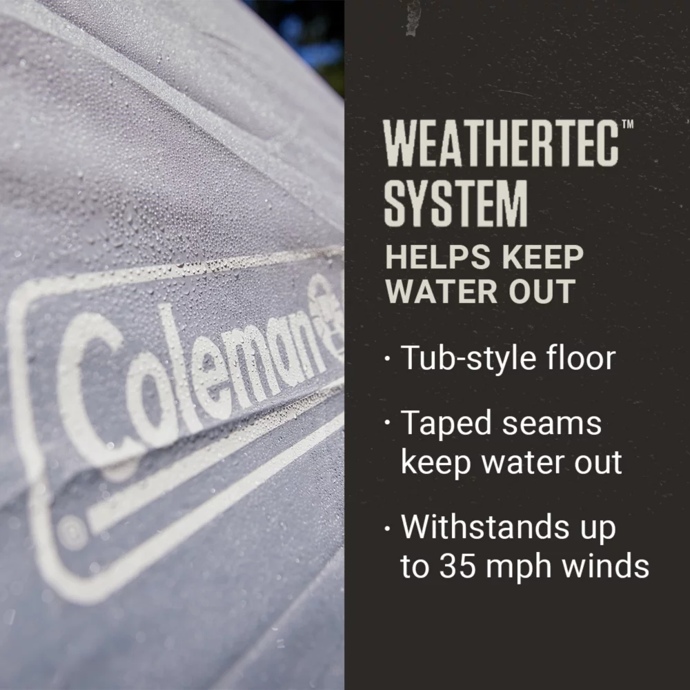 • WEATHERTEC™ PROTECTION: Tub-like floor, welded corners, inverted seams and taped seams on the rainfly and tent body help keep water out; frame has been tested to withstand winds up to 35 mph