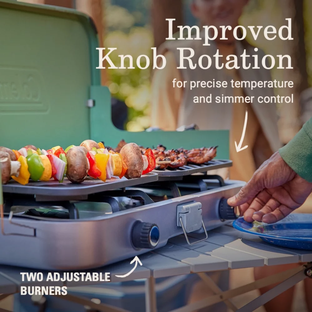 - IMPROVED COOKING CONTROL: Improved knob rotation for precise temperature and simmer control of 2 adjustable burners; rotary ignition for quick, matchless lighting